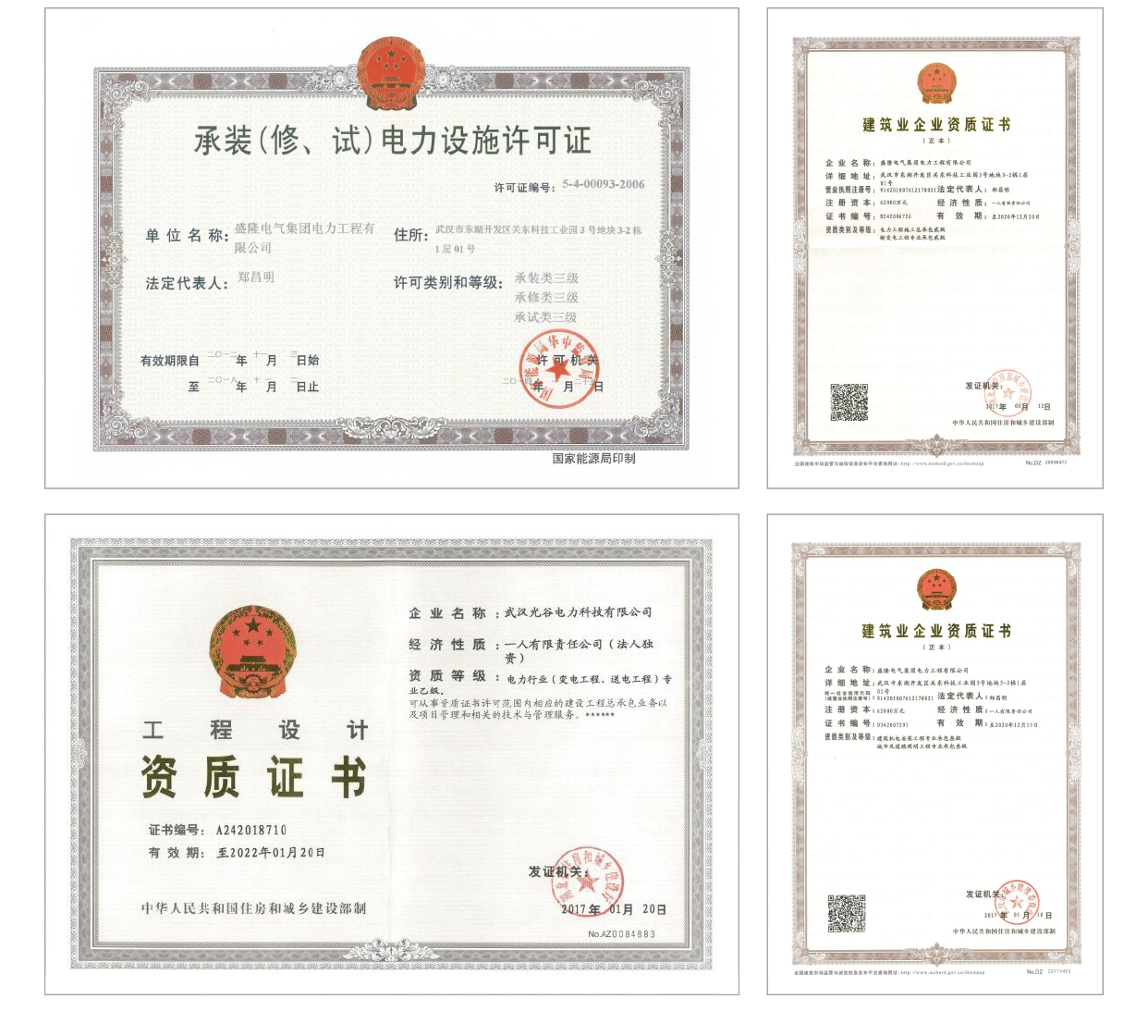 Our Power Engineering Company has the Grade II General Contracting for Electric Power Works Qualification, and can undertake the construction of power generation projects with a single capacity up to 200,000 kW, and up to 220kV class of transmission lines and sub-stations. We also have the Grade II Professional Contracting for Power Transmission and Transformation Works Qualification, and can undertake the construction of power transmission lines and sub-stations projects up to 220kV class. We have the Grade II Professional Contracting for Urban and Road Lighting Works Qualification, and can undertake the construction of urban and road lighting projects with a single contract up to 12 million yuan. The company also has the Grade II Professional Contracting for Building Mechanical and Electrical Installation Works Qualification, can undertake the installation of equipment, lines, pipelines, 10kV class of sub-stations works and non-standard steel structures in various type of building projects with a single contract up to 20 million yuan. We also have the Grade III License for Undertaking the Installation, Repair, and Test of Electric Power Facilities Qualification, can undertake the installation, repair, or test of electric power facilities up to 110kV class. Our Optics Valley Power Company has the Grade III Design for Power Transmission and Distribution Qualification, and can undertake the design of major and supporting works for small and medium construction projects.