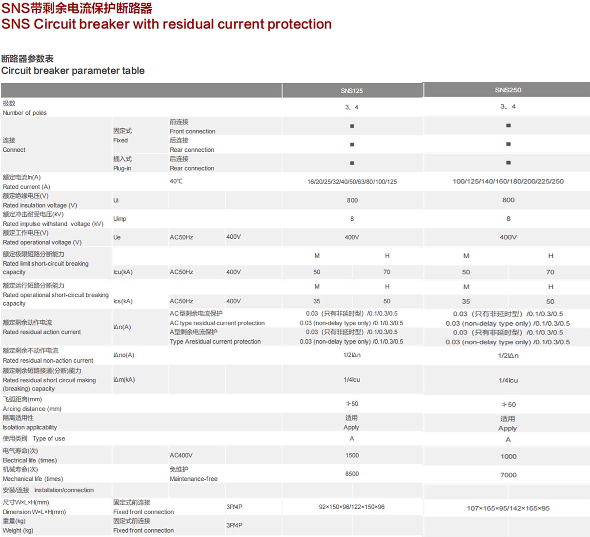 SNS circuit breaker with residual current protection can provide indirect contact protection for people, and can also provide protection for the fire danger caused by long-term grounding fault that cannot be detected by overcurrent protection. When other protection devices fail, the circuit breaker with rated residual action current of 30mA can directly play an additional protection role. There are four shell frames of 125,250,400 and 630, and the current ranging from 16 A to 630 A and the residual current from 30 mA to 1000 mA.