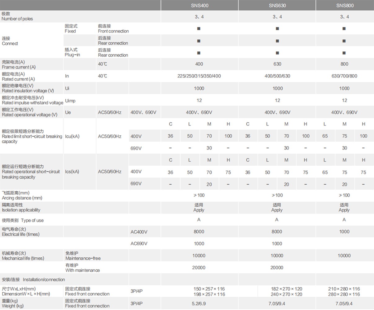 SNS electronic circuit breaker has overload long delay inverse time, short circuit short delay inverse time, short circuit short delay fixed time, short circuit instantaneous, undervoltage protection and phase protection function (optional). Among them, the controller with communication interface can be "four remote", to achieve parameter modification, fault reading to meet the requirements of the control center and automation system. There are 125M/H type, 250M/H type, 400M/H type, 630M/H type, 800M/H type five shell frame, current from 12A to 800A.