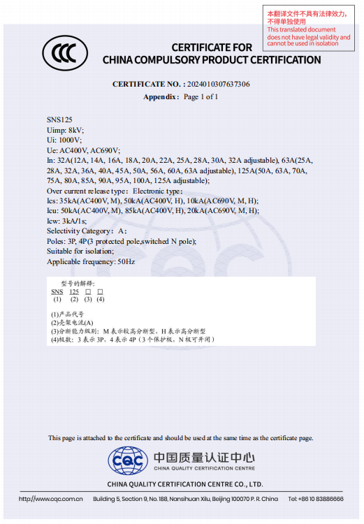 SNS125, SNS250 L/M/H type, SNS400,SNS630 L/M/H type thermal magnetic type and the above specifications four pole neutral pole type A, B circuit breakers can be with "thermal overload alarm without tripping" function to ensure power supplycontinuity and meet the requirements of Article 6.3.6 of GB50054.