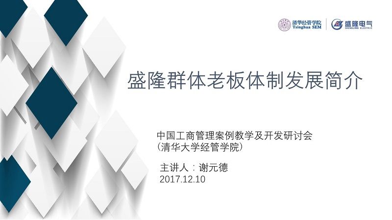 12月10日上午,“2017年冬季中國(guó)工商管理案例教學(xué)及開發(fā)研討會(huì)”在清華大學(xué)經(jīng)管學(xué)院偉倫樓舉行。盛隆電氣集團(tuán)董事長(zhǎng)謝元德受邀以《盛隆群體老板體制發(fā)展簡(jiǎn)介》為主題發(fā)表演講。來(lái)自清華大學(xué)、復(fù)旦大學(xué)等全國(guó)各地高校近200名經(jīng)管專業(yè)的教授、學(xué)者參加。