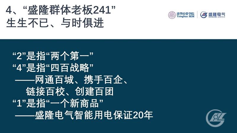 盛隆群體老板241:“2”是指“兩個(gè)第一”;“4”是指“四百戰(zhàn)略”——網(wǎng)通百城、攜手百企、鏈接百校、創(chuàng)建百團(tuán);“1”是指“一個(gè)新商品”——盛隆電氣智能用電保證20年。