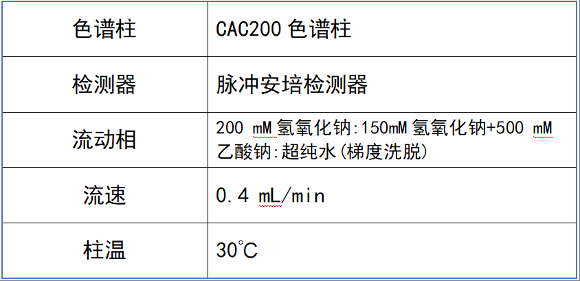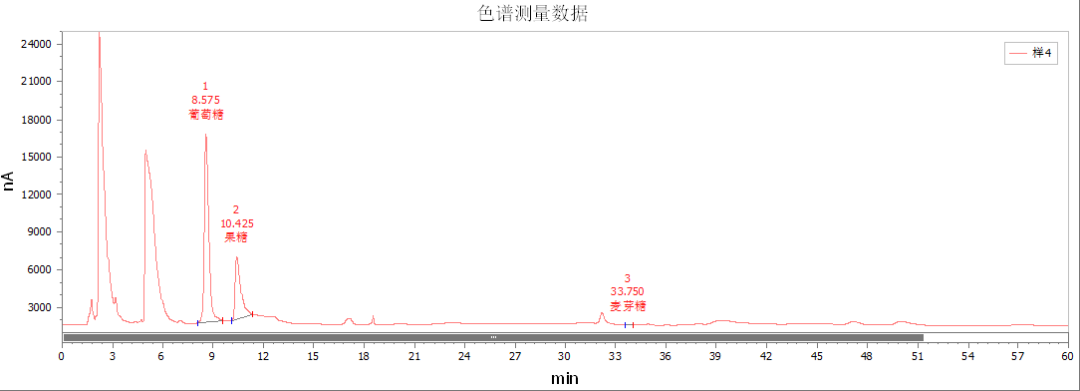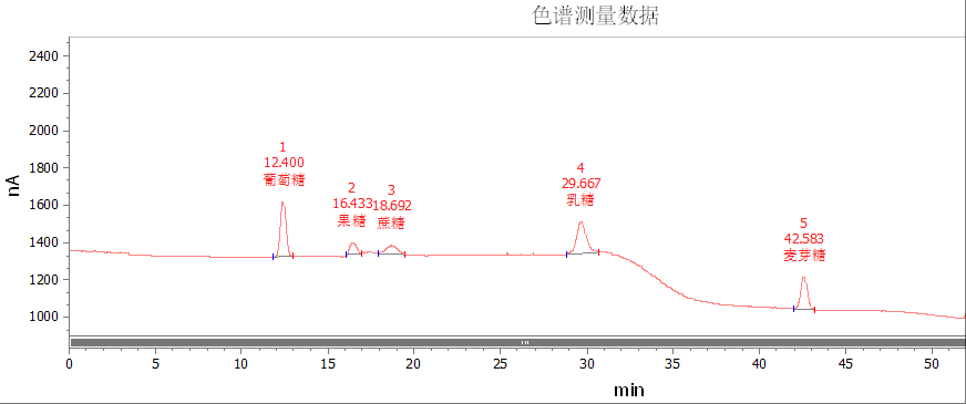 新標準要求明確標示糖含量 哪種檢測方法能精準檢測糖含量呢? GB 5009.8-2023《食品安全國家標準食品中果糖、葡萄糖、蔗糖、麥芽糖、乳糖的測定》明確了食品中五種糖的檢測方法,其中離子色譜法作為第二法適用于全品類食品果糖、葡萄糖、蔗糖、麥芽糖、乳糖的測定,是應用范圍最廣的檢測方法。 盛瀚解決方案 儀器配置: CIC-D200E糖檢測專用儀 ?高通量自動進樣器 60、120位進樣器可選,樣品處理量多,效率更高; 全定量、部分進樣、無損進樣等多種進樣方式可選,滿足不同用戶使用場景。 ?電化學檢測單元 直流、脈沖、積分三種模式可選,選擇更靈活; 內(nèi)置柱溫箱,連接死體積更小,出峰分辨率更佳; ?高效梯度混合泵 多通路流路自動混合,精度高、易控制、更省心; 耐腐蝕,流路pH范圍0~14,可適用多種有機溶劑,性能優(yōu)異。 SH-CAC-200 色譜柱可以快速高效地分離單糖、雙糖,具有理想的分離度;與脈沖安培檢測 (PAD) 相結(jié)合,在高 pH 條件下可進行高分辨率的分離,無需衍生化。 前處理方法: ①稱取試樣2g(精確至0.001 g)于100 mL比色管中,加入約50 mL 50℃~60℃熱水,渦旋或攪拌 ②待樣品充分溶解,加入2 mL乙酸溶液,渦旋混勻,超聲30 min ③轉(zhuǎn)移至100 mL容量瓶中并用水定容至刻度,混勻,靜置20 min ④依次過0.45 μm水性濾膜針頭過濾器和C18固相萃取小柱 色譜條件: 樣品譜圖: (標準溶液譜圖 點擊圖片可放大查看) (樣品1溶液譜圖 點擊圖片可放大查看) (樣品2局部放大譜圖 點擊圖片可放大查看)