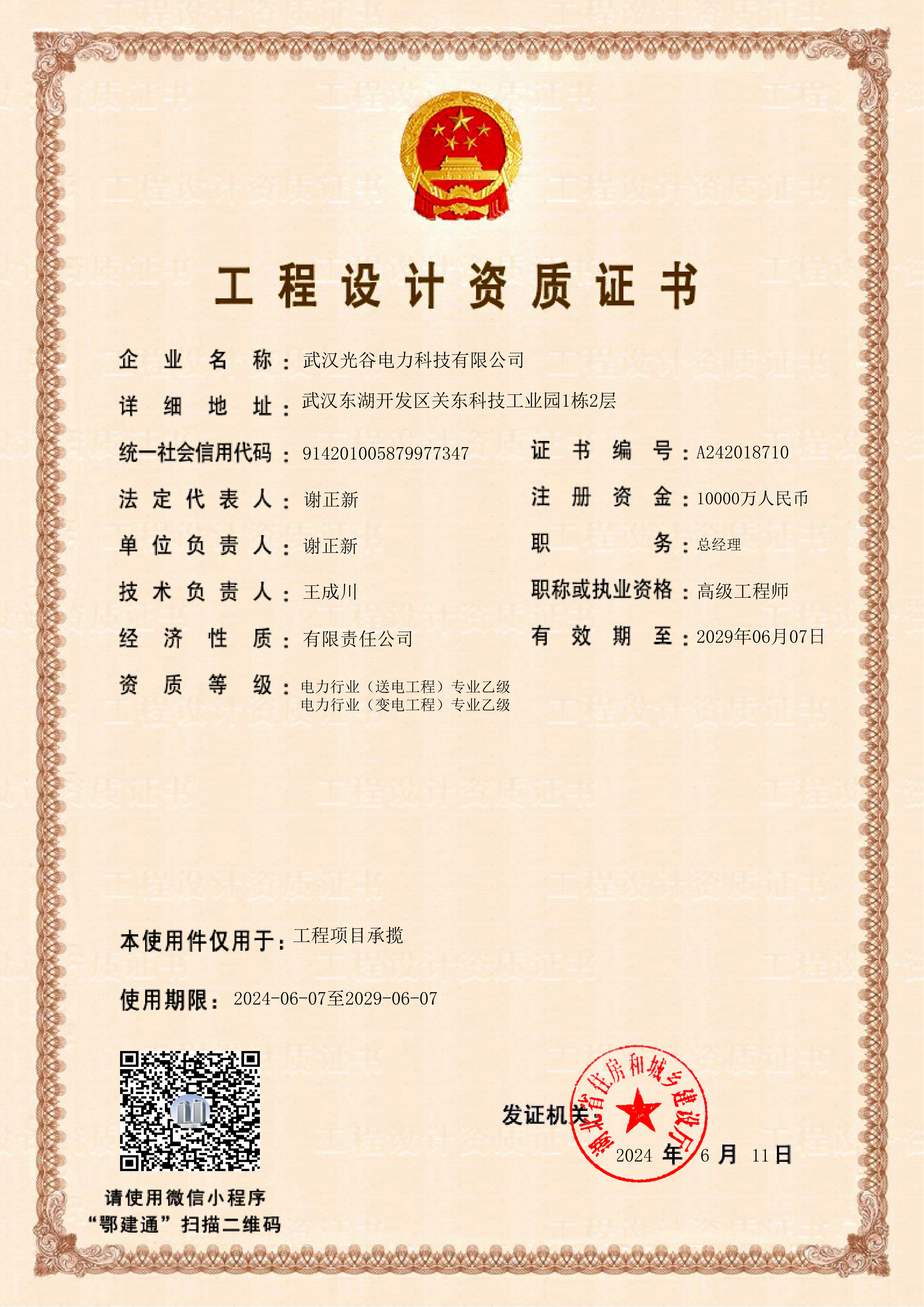 武漢光谷電力科技有限公司,成立于2012年2月。公司目前具有乙級送變電設計資質、電力工程施工總承包資質、輸變電工程專業承包資質、承裝(修、試)類電力設施資質、建筑機電安裝工程專業承包資質。
