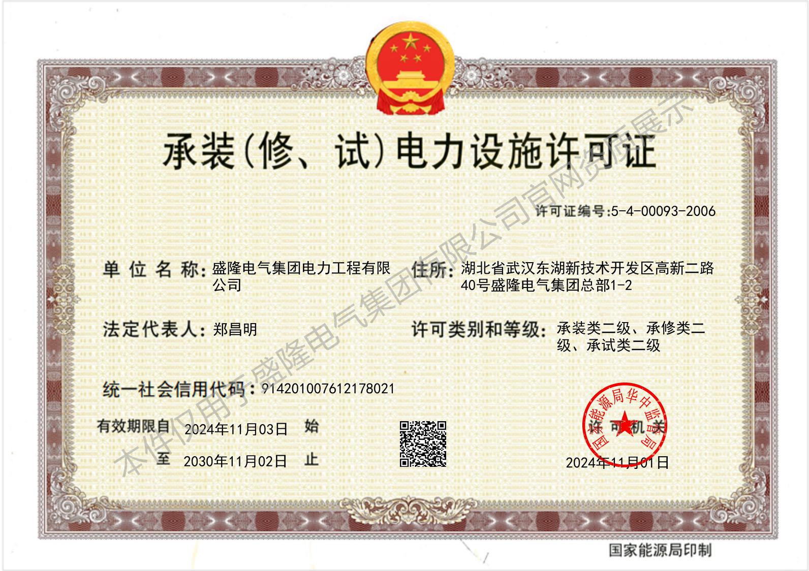 公司具有電力工程施工總承包貳級、輸變電工程專業承包貳級、建筑機電安裝工程專業承包壹級、城市及道路照明工程專業承包貳級、以及消防設施工程專業承包貳級、電子與智能化工程專業承包貳級和市政公用工程施工總承包貳級等施工資質,同時具有國家能源局頒發的《承裝(修、試)電力設施許可證》貳級資質。可承接單機容量20萬干瓦及以下發電工程、220千伏及以下送電線路和相同電壓等級變電站工程的施工、配套電力設施的安裝、維修和試驗業務,以及各類建筑工程項目的機電設備、線路、管道的安裝、非標準鋼結構件的制作安裝工程、單體建筑面積5萬平方米以下的消防工程、城市道路照明工程、建筑智能化工程、市政工程等。
