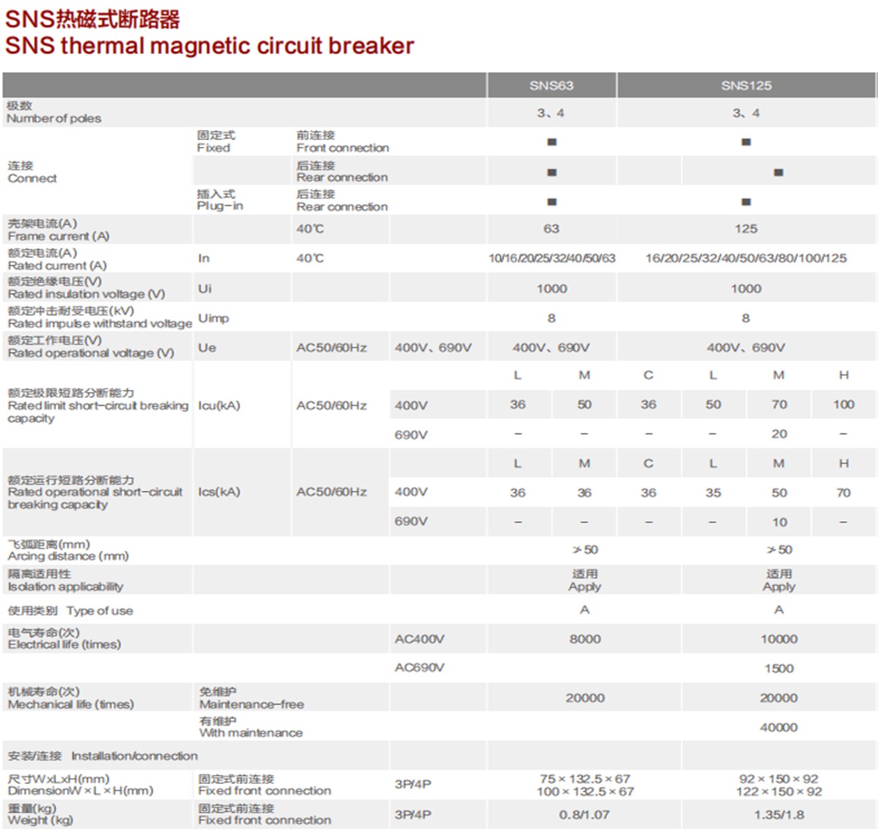 SNS熱磁式斷路器具有過載、短路和欠壓保護(hù)功能,能保護(hù)線路和電源設(shè)備不受損壞。有63型、125型、250型、400型、630型、800型六個殼架,電流從16A~800A。