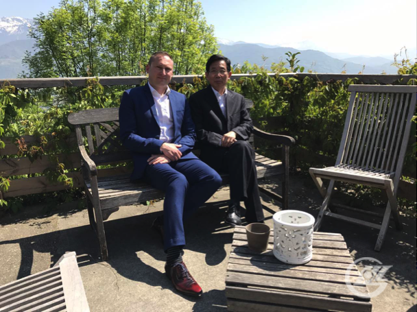 施耐德交易流程副總裁文森勒格朗先生,在阿爾卑斯半山腰著名的金角餐廳宴請訪問團。餐后,在阿爾卑斯山溫暖和煦的陽光中,董事長與文森副總裁合影留念。