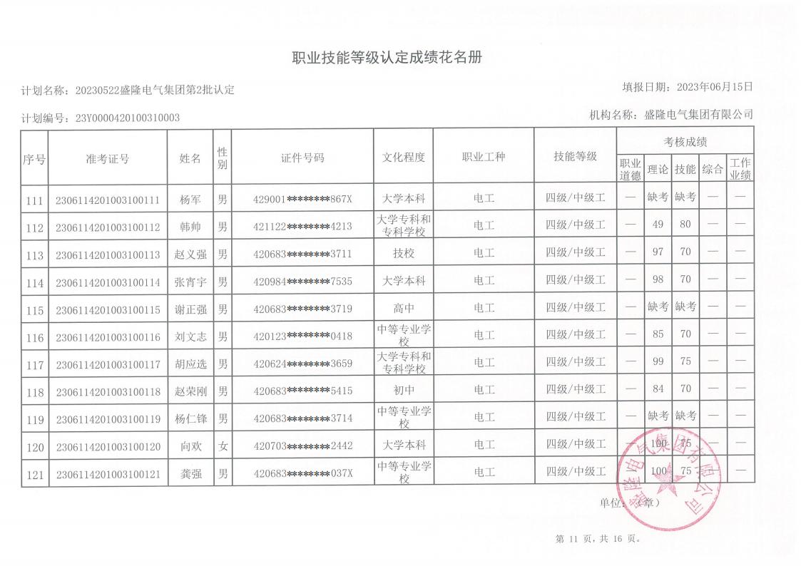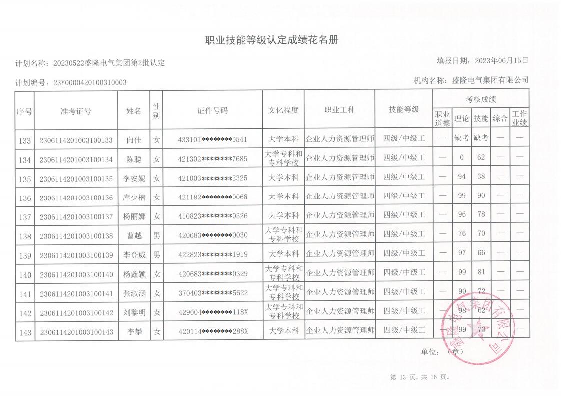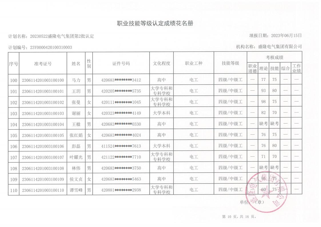 根據湖北省人力資源和社會保障廳《湖北省職業技能等級認定工作實施細則》(【2020】45號)文件的有關規定,現將盛隆電氣集團2023年第四批職業技能等級認定——電工(四級)、企業人力資源管理師(四級)成績予以公示,詳情見附件。