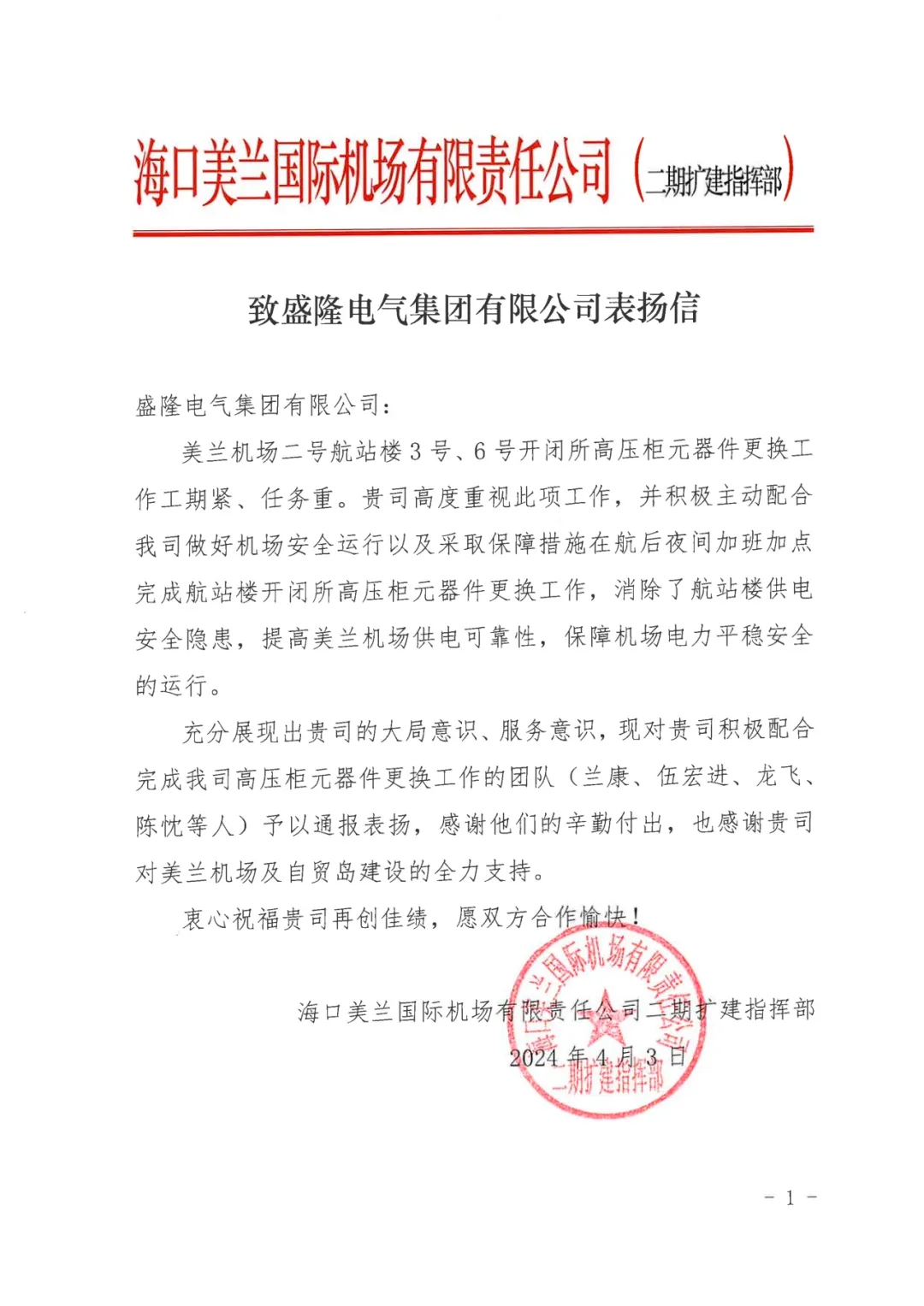 海口美蘭國際機場給盛隆電氣發來表揚信