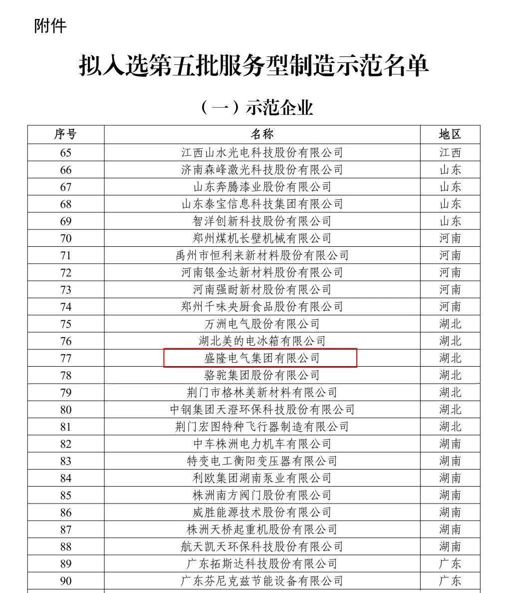 國家示范名單公布!盛隆電氣入選國家服務型制造示范企業