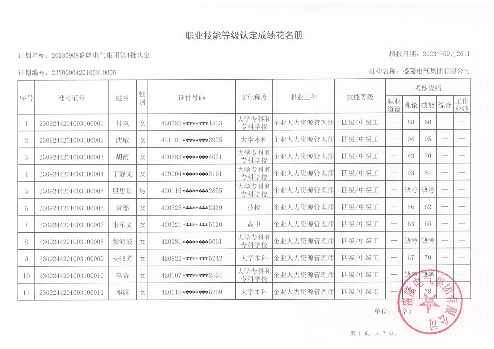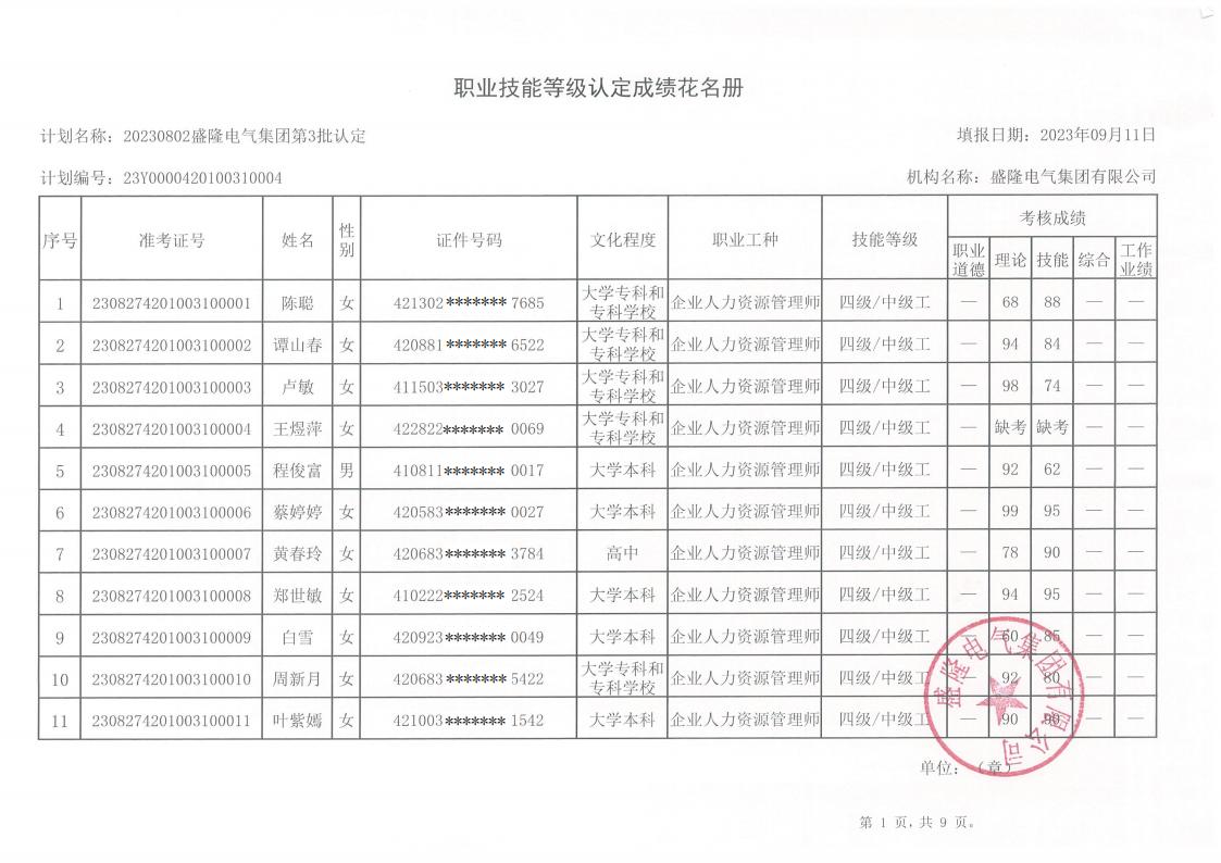 盛隆電氣集團(tuán)2023年第六批職業(yè)技能等級(jí)認(rèn)定成績(jī)公示