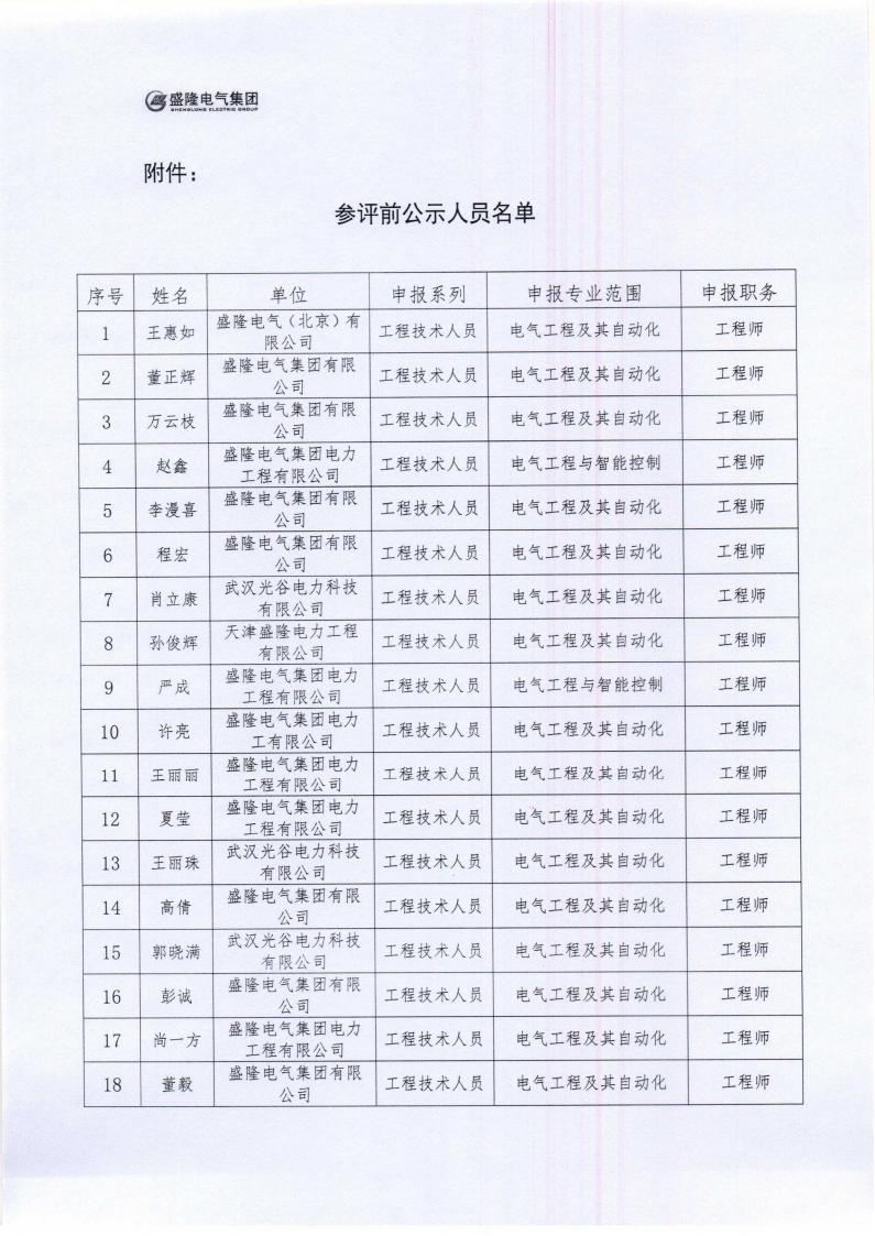 關于參加 2023 年度上半年盛隆電氣集團電氣、機械專業技術職稱評審人員的評前公示