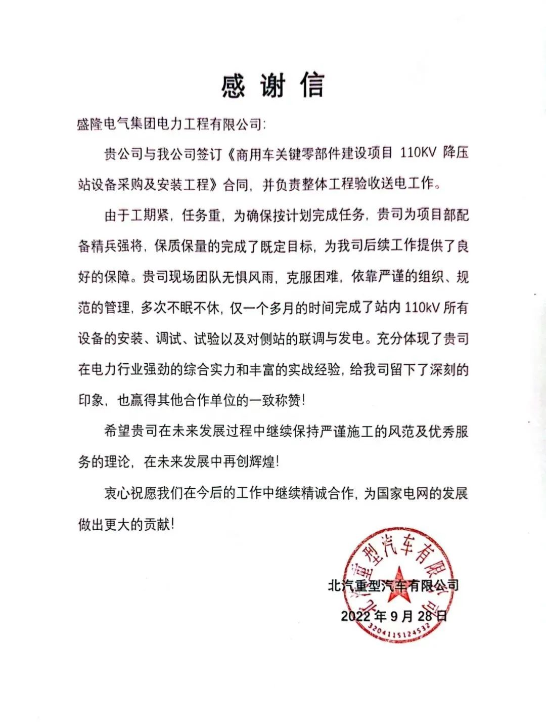 9月28日晚上8時8分,江蘇省常州市新北區韶山路18號,北汽重型常州商用車110kV降壓站項目內,所有人屏息以待。隨著電力調度人員指令的發出,運行操作人員合上開關,降壓站一次送電成功!僅用50天,盛隆電氣克服工期短、難度大等困難提前通電,以強勁的綜合實力、豐富的實戰經驗,贏得業主單位稱贊。北汽重型汽車公司發來感謝...2023-03-10 -