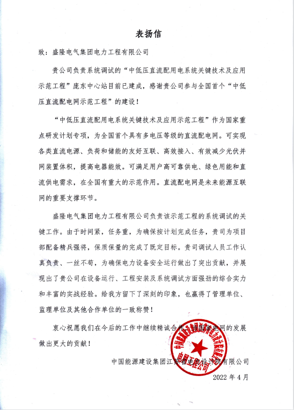 近日,盛隆電氣集團電力工程有限公司收到項目建設單位賀信,對盛隆電力在“中低壓直流配用電系統關鍵技術及應用示范工程”中的工作表示高度贊揚。表揚信位于江蘇省蘇州市同里鎮的“中低壓直流配用電系統關鍵技術及應用示范工程”是國家重點研發計劃項目,也是全國首個具有多電壓等級的直流配電網。建成后,可實現各類直流電...2022-05-08 -