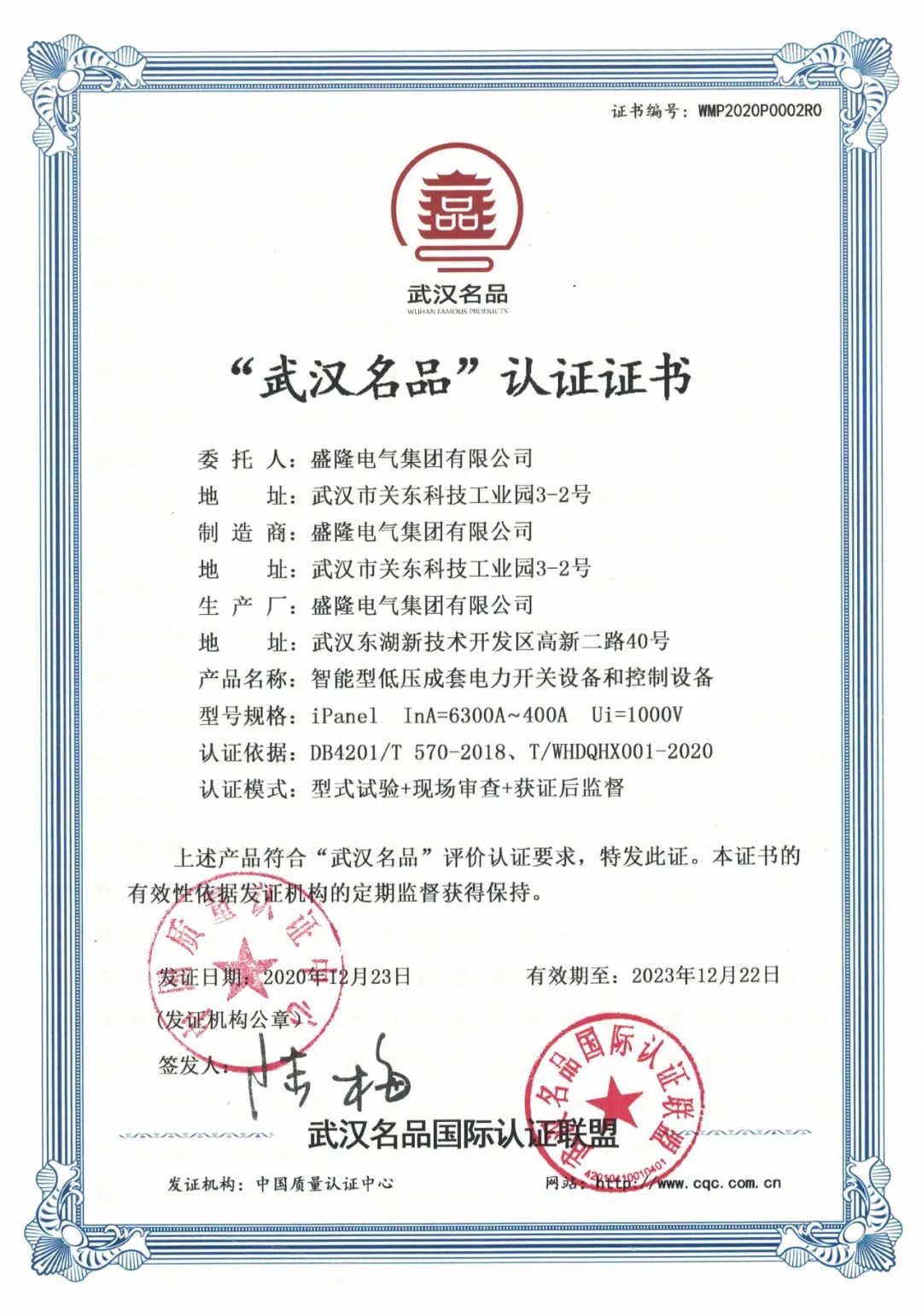 盛隆電氣iPanel智能低壓柜被評為“武漢名品”!
